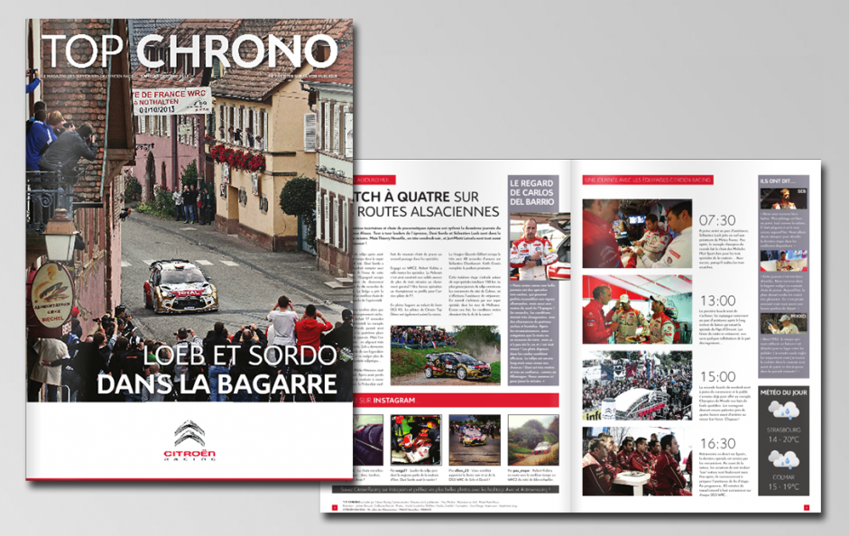 Édité chaque année dans le cadre du Rallye de France Alsace, Top Chrono est un magazine quotidien de 8 pages. Chaque jour, les supporters de Citroën Racing découvrent un contenu exclusif, imaginé par l’équipe de Zone Rouge !